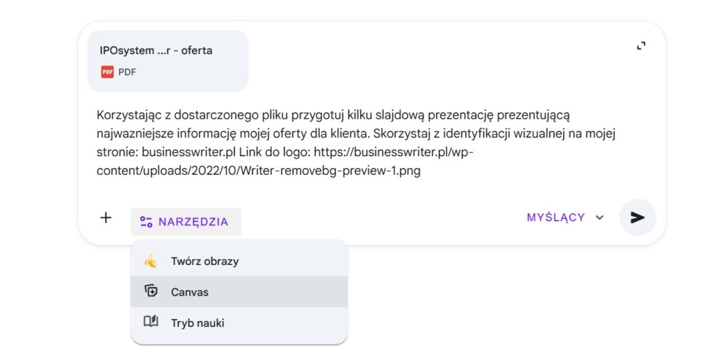 Żeby wygenerować prezentację zacznij od wgrania przygotowanej wcześniej oferty tekstowej do Google Gemini.