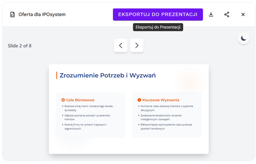 Kliknij eksport do prezentacji i dopracuj slajdy wg własnego uznania tak aby były spójne z identyfikacją wizualną Twoich pozostałych materiałów.